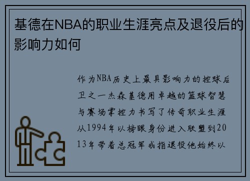 基德在NBA的职业生涯亮点及退役后的影响力如何